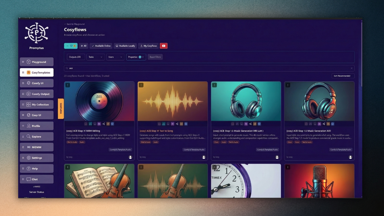 Obtenga bandas sonoras ricas, efectos de sonido y líneas de voz generadas automáticamente. Omita los editores de audio externos: todo se hace en Promptus.