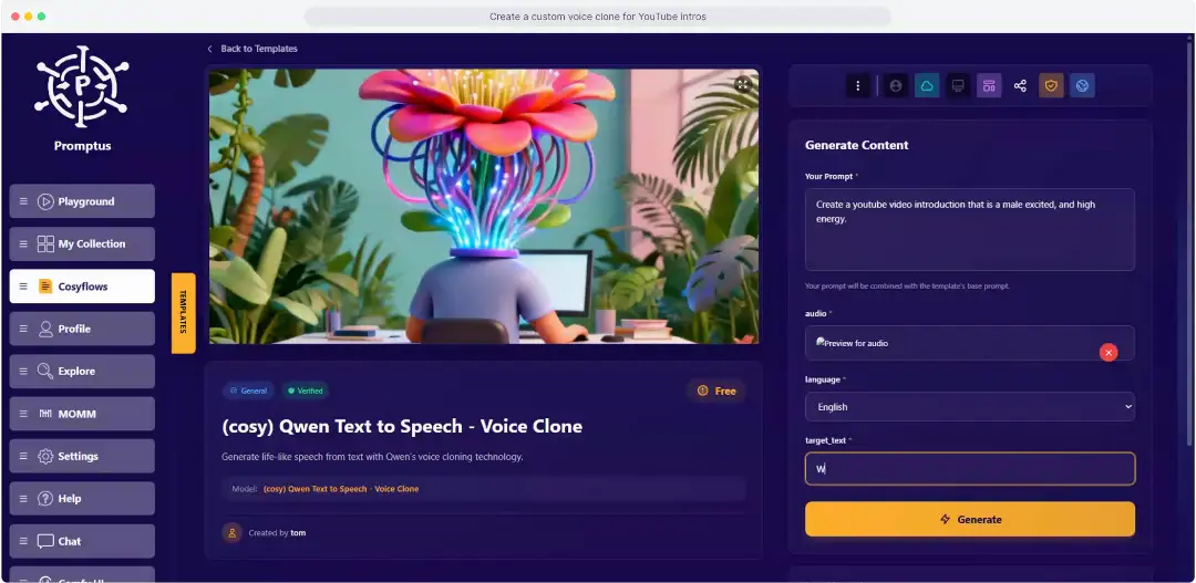 Simplemente toca el icono del micrófono en el navegador o en la aplicación local para dictar tu prompt. Promptus utiliza tecnología Voice-to-Text para transformar tus palabras habladas en imágenes y videos de alta resolución al instante.